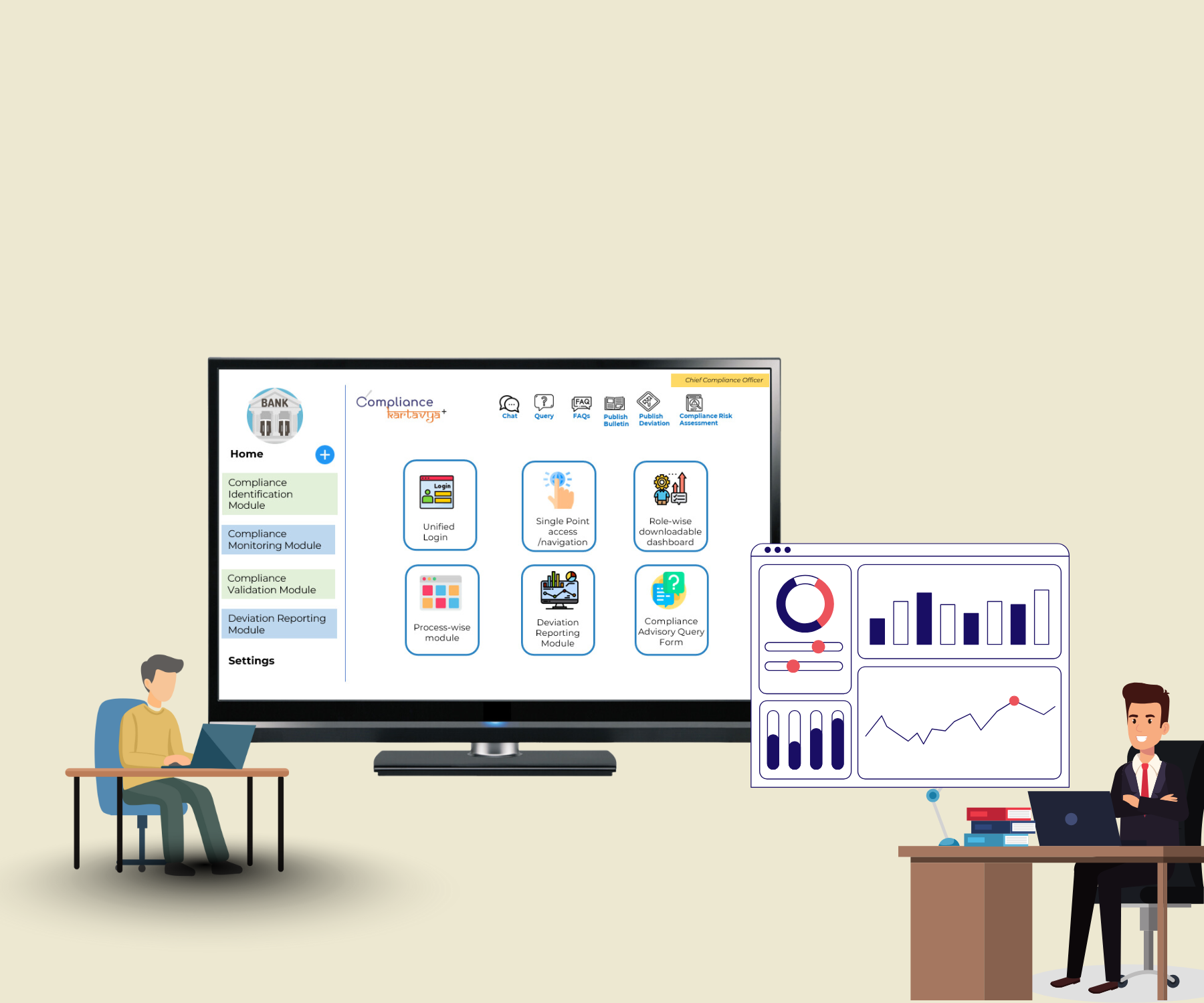 Get real-time, role-specific dashboards designed for Compliance, End Users, or Management Teams. View live, intelligent data represented visually. Export this information in multiple formats, and make strategic decisions, know your organization’s compliance health — all from a single screen.
